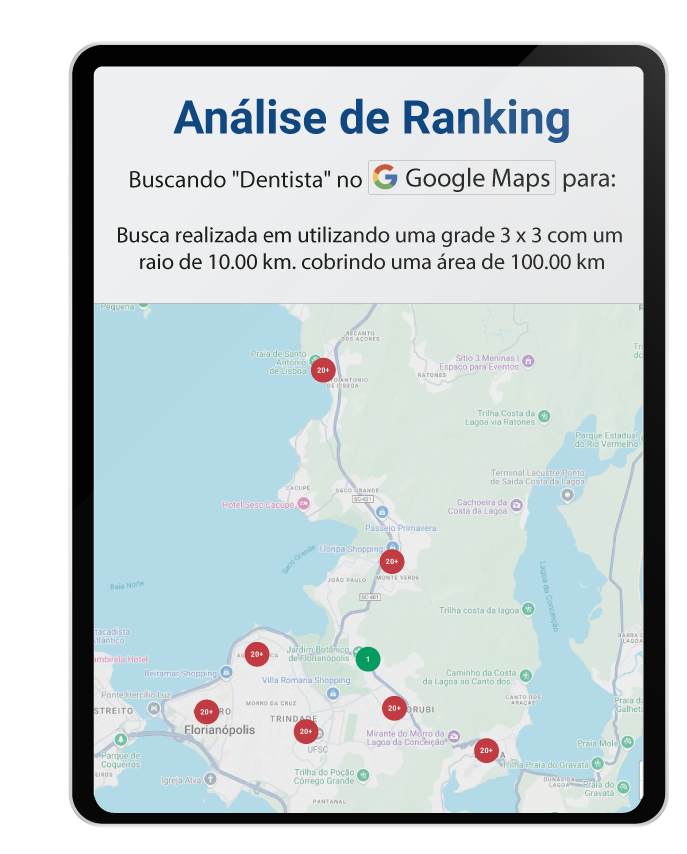 Realizamos uma análise detalhada do posicionamento orgânico do seu perfil em buscas locais feitas num raio de 5 ou 10 km ao redor da sua clínica para termos-chave específicos, como buscas de especialistas: “dermatologista”, “oftalmologista” ou “dentista” etc ou serviços específicos como exames ou tratamentos.