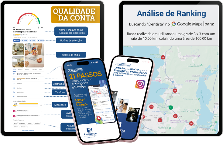 Com o Método dos 21 Passos, você vai otimizar seu perfil no Google Meu Negócio, garantindo que todas as informações estejam completas e atualizadas. Isso inclui boas práticas de atendimento online, como interagir com avaliações e responder a perguntas, além de adicionar fotos, vídeos e artigos. Um perfil completo e com provas sociais, como boas avaliações, ajuda a construir sua autoridade digital, garantindo que você apareça no topo das buscas locais e atraia clientes prontos para agendar consultas e tratamentos.